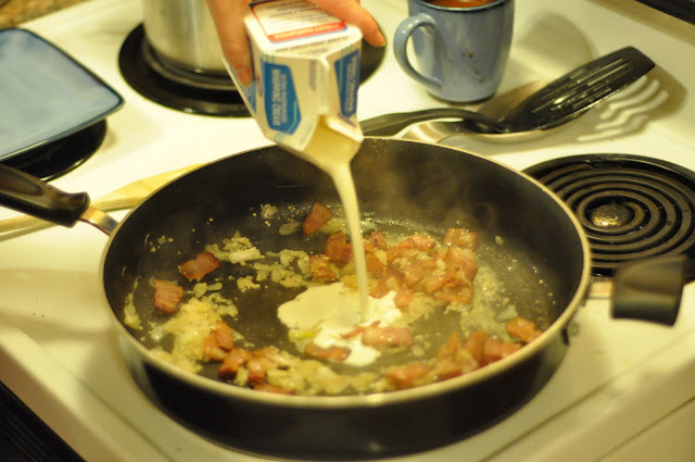 This was inspired by a Diners, Drive-Ins and Dives episode and I wanted to try something without looking up on Allrecipes. Really with the ingredients I was failproof......bacon? cream? pasta? yes! yes! and yes! So here we go. (On a sidenote, I was making this for 2....in all honesty I could have eaten the whole pan but you may want to double depending on the size group you are cooking for....or your appetite!)